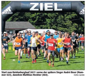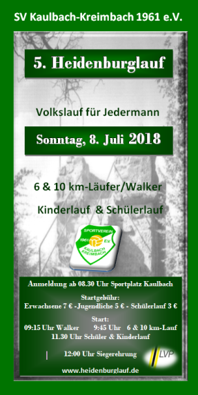 Wieder einmal sind dazu nicht nur die klassischen Läufer, sondern auch Walker zur Teilnahme aufgerufen. Den Anfang machen die Walker, sie werden schon um 9.15 Uhr auf die Strecke geschickt. Eine halbe später fällt der Startschuss für den zehn Kilometer langen Hauptlauf sowie den sechs Kilometer langen Schnupperlauf. Der Kinderlauf beginnt um 11.30 Uhr.Den Hauptlauf gewann Max Kirschbaum (LG Ohmbachsee) bereits zweimal, je einmal siegten André Bour (TuS Heltersberg) und Matthias Hecktor (FV Olympia Ramstein). Bei den Frauen waren Andrea Groch (TSG Kaiserslautern), die US-Amerikanerin Caroline Jepleting (TSG Kaiserslautern) und zweimal Jessica Kammerer (TuS Heltersberg) erfolgreich. Das größte Teilnehmerfeld gab es vor zwei Jahren, als 80 Sportler gezählt wurden. Der Lauf ist besonders wegen seiner schönen und anspruchsvollen Strecken beliebt. Nach dem Start auf dem Sportplatz des SV Kaulbach-Kreimbach müssen die Sportler zunächst ein 1,5 Kilometer langes, asphaltiertes Flachstück absolvieren. Danach sind dann aber die Berglaufqualitäten gefragt. Über eine Länge von etwa 2,5 Kilometer gilt es, 163 Höhenmeter hinauf zum Heidenburggipfel zu überwinden. Auf dem Weg zurück zum Sportplatz geht es dann aber (fast) nur noch bergab.