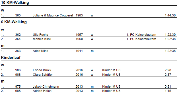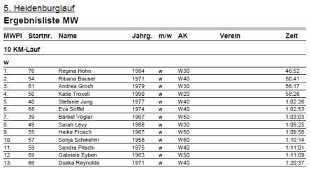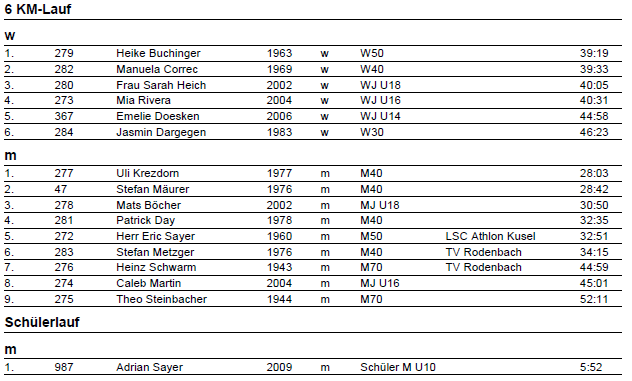 Im Feld der Läuferinnen feierte Regina Höh (SV Rodenbach) einen überlegenen Erfolg mit fast vier Minuten Vorsprung vor Ribana Bauser (LLG Landstuhl). Für Regina Höh, die im Landkreis Kusel unter ihrem Mädchennamen Schweitzer als ehemalige Bienenkönigin des Altenglaner Imkervereins eher bekannt ist, war es der erste Start in Kreimbach-Kaulbach: „Die Laufstrecke hat mir gut gefallen. Sie ist allerdings ganz schön anspruchsvoll“, sagte sie. Der zum Teil steile Anstieg zur Heidenburg machte einigen Läufern zu schaffen.