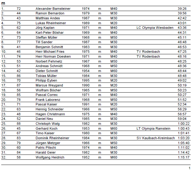 Barnsteiner erhöhte das Tempo, so dass Bernadon nicht mehr folgen konnte. Als Barnsteiner nach zehn Kilometern wieder das SV-Stadion erreichte und schließlich mit Siegeszeichen die Ziellinie überquerte, hielt die Uhr bei 39:26 Minuten an. Exakt eine halbe Minute später kam Bernadon ins Ziel. Der von André Bour aus Rutsweiler/Glan vor zwei Jahren aufgestellte Streckenrekord von 37:47 Minuten wurde jedoch klar verfehlt.